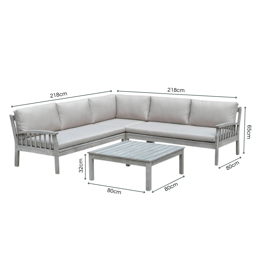 Total sofa length (bench's and corner piece): 218cm each side to the corner
